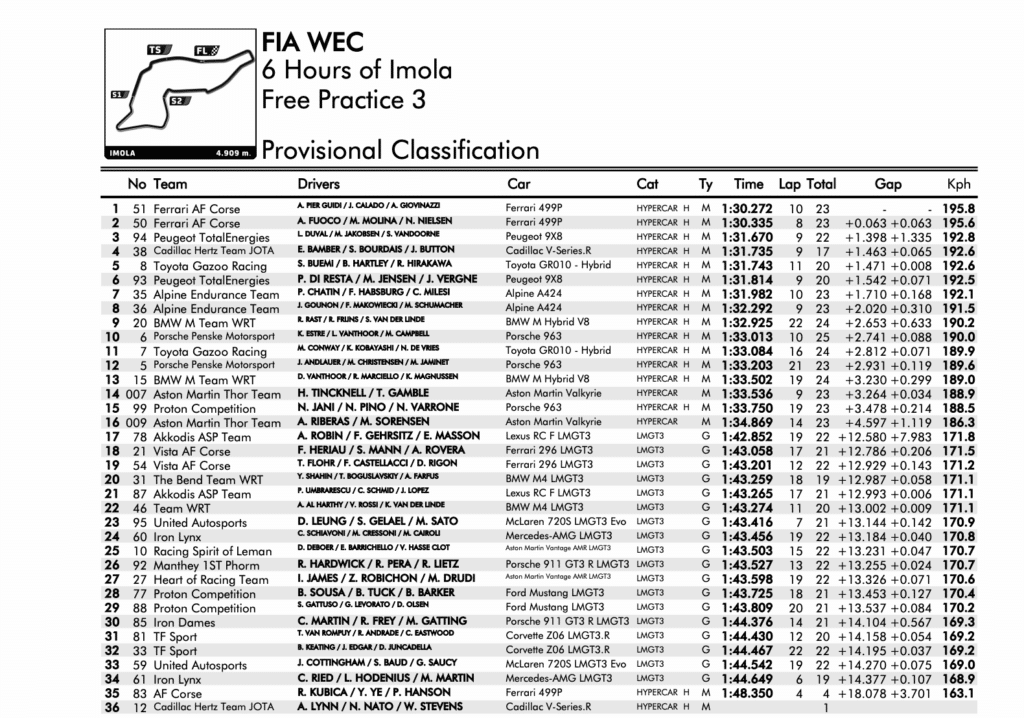 In classe LMGT3 la prima posizione nelle PL3 della 6 Ore di Imola WEC 2025 è andata alla #78 Lexus Akkodis ASP in 1’42″852, che si è imposta sulla #21 Vista AF Corse con Simon Mann, Francois Heriau e Alessio Rovera e sulla gemella #54 (Rigon, Castellacci, Flohr). Sesta la #46 BMW Team WRT di Valentino Rossi. Ottava la prima Mercedes dei cesenati di Iron Lynx, la #60 con Claudio Schiavoni, Matteo Cairoli e Matteo Cressoni, staccati di sei decimi dalla vetta.