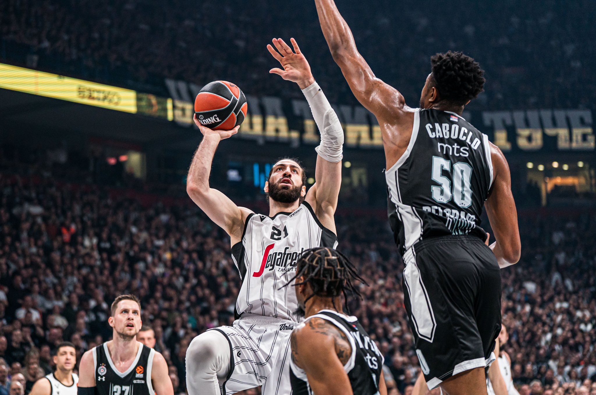 Avvio negativo dei felsinei che subiscono un 5-0 iniziale prontamente fermato dalla tripla del neo entrato Abass che si fa trovare pronto in angolo. La risposta al parziale casalingo è notevole con una Virtus che corre bene il campo e grazie alle conclusioni di Lundberg e Abass si porta nuovamente sul +9 obbligando Obradovic al timeout. Ritmi altissimi alla Stark Arena, intensità fisica da playoff e Vu Nere che trovano anche il +13, Caboclo però piazza subito la risposta dall’angolo riaccorciando sul -10 prima e sul -8 poi con la conclusione di un brillante Nunnaly. Confusione e percentuali che calano a picco negli ultimi due minuti di primo tempo che si chiude con un buon 36-41 per gli ospiti.