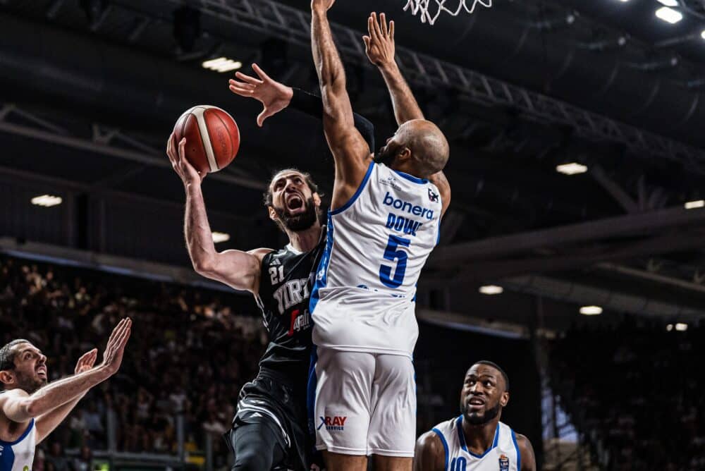 Ci mette tanto corpo Brescia che complica e non poco le operazioni bianconere in attacco, dove alle volte si sfocia nella tonnara. Non è altrettanto dura la formazione felsinea che concede agli ospiti di eseguire il proprio gioco, con il quale si portano sul +8. A non convincere nei primi 15′ di gioco, oltre alla formazione bianconera, è anche il metro arbitrale “confuso” adottato dalla terna. I lombardi trovano ottime percentuali dall’arco e sono capaci di rispedire indietro ogni minimo tentativo di ricucire il parziale messo in scena da Toko e compagni. C’è solo in 21 georgiano in campo per la Virtus Bologna che praticamente da solo riporta sul 40 pari la sfida con 21 punti personali e 29 di valutazione in 15 minuti. Squadre che si portano all’intervallo lungo sul 41-45 e una V Nera che deve trovare gli uomini per supportare la gara stratosferica di Shengelia.