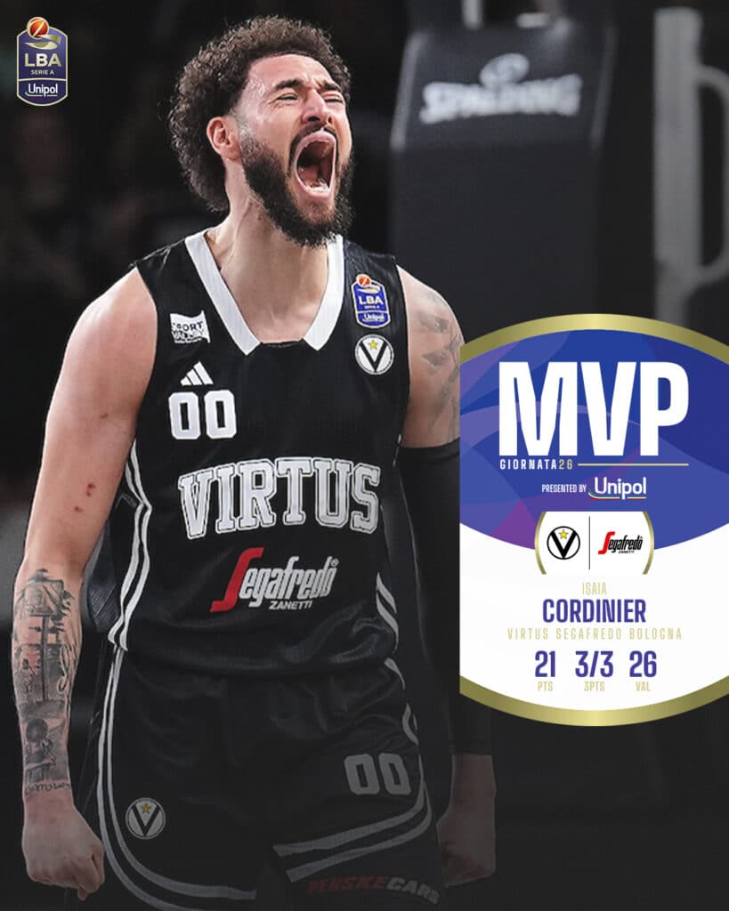 Isaia Cordinier è l’MVP della 26esima giornata del Campionato Italiano di Serie A. Il giocatore della Virtus Segafredo Bologna è da inizio anno alle prese con una stagione complicata, durante la quale le buone prestazioni si sono alternate ad altrettante partite opache. Il numero 00 ha fatto parlare molto di sé durante l’anno, con le voci di una possibile partenza verso Madrid che si erano fatte molto forti nella prima parte della stagione. Il suo futuro bianconero, al momento, è ancora incerto ma una cosa è sicura: la Virtus Bologna ha bisogno della migliore versione di Cordinier per provare a riportare a Bologna il tricolore che manca dalla stagione 2020-21.