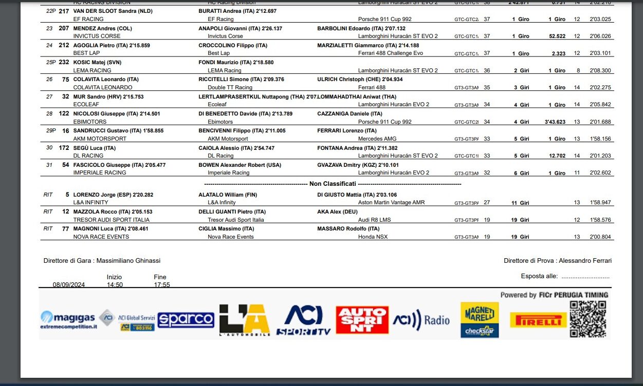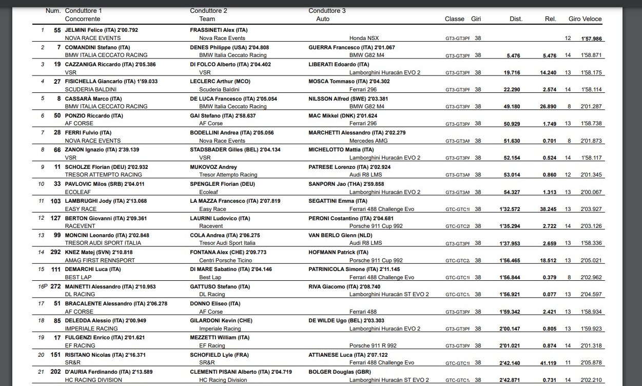Viene esposta di nuovo la bandiera rossa: non si può più correre in queste condizioni. La gara non riprende: vince dunque la Honda #55 di Nova Race; podio per la BMW #7 di Ceccato e la Lambo #19 di VSR; quest’ultima scavalca la Ferrari #27 in cima alla classifica assoluta.