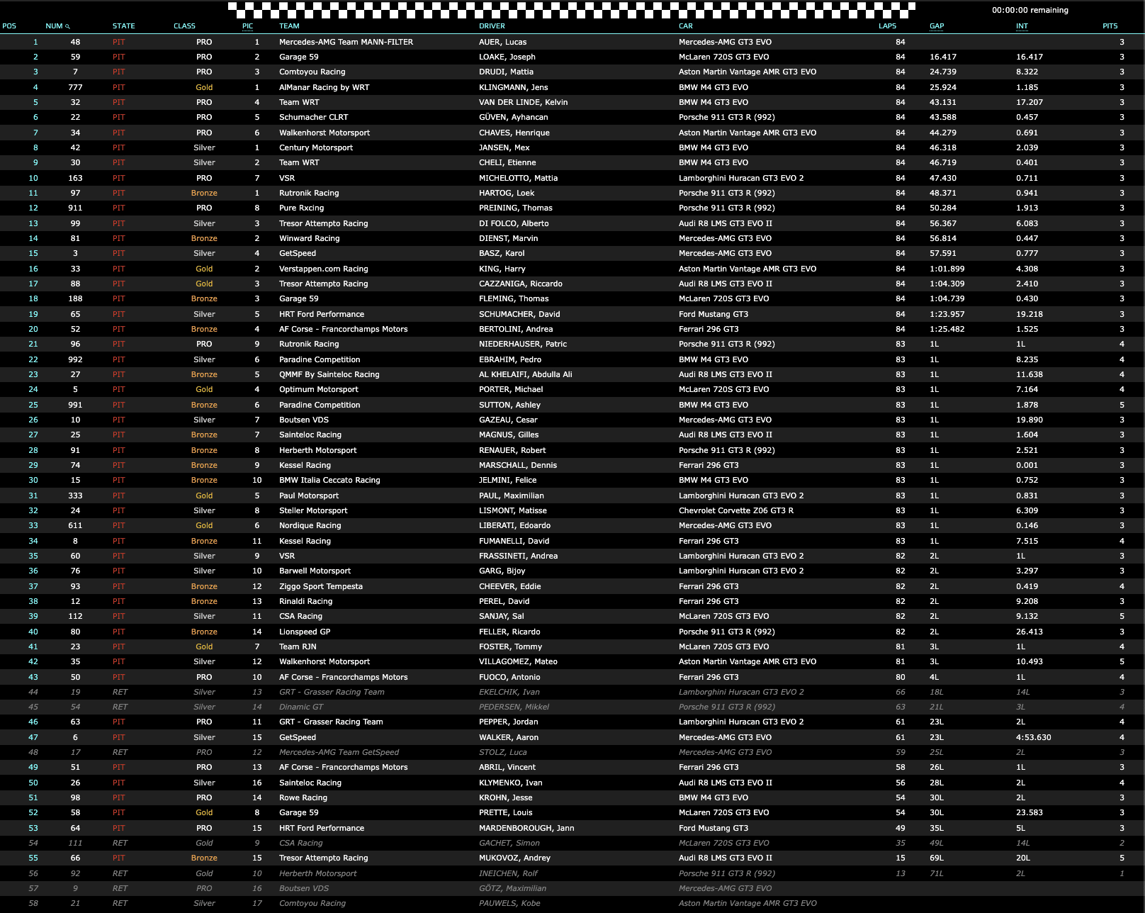 La corsa si è avviata verso l’ultima fase senza scossoni fino a quattro minuti dal termine, quando la #60 Lamborghini VSR di Andrea Frassineti, in lotta per la terza posizione con la #99 Audi Tresor Attempto Racing è andata in ghiaia all’uscita della Variante Ascari, causando l’ennesima short Full Course Yellow. A pochi istanti dal termine viene ripresa la corsa, con la vittoria della #48 Mercedes-AMG “Mamba” davanti alla #59 McLaren Garage 59 e alla #7 Aston Martin Comtoyou.