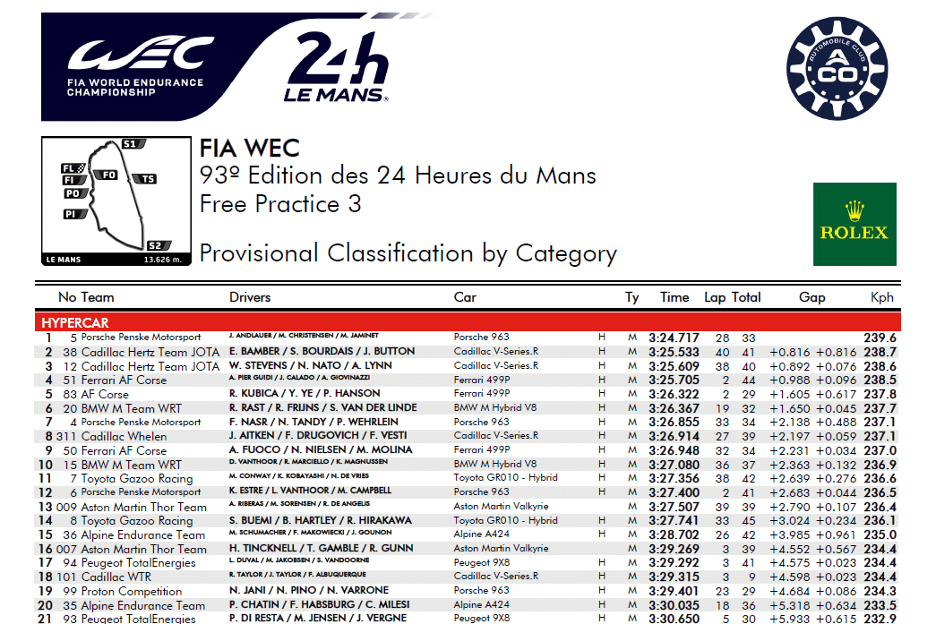 La classifica delle PL3 delle Hypercar della 24 Ore di Le Mans 2025