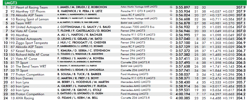 In LMGT3 il miglior tempo è per l’Aston Martin #27 di Heart of Racing con anche Matteo Drudi al volante, mentre chiude in quinta posizione la BMW M4 GT3 #46 con Valentino Rossi.