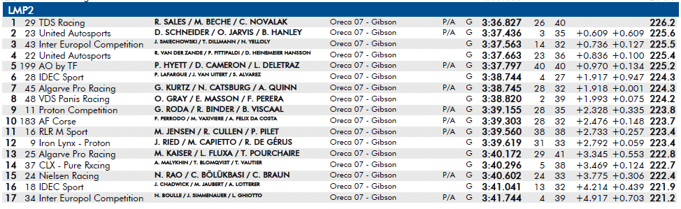In LMP2, AF Corse è stata protagonista con la Oreca 07 Gibson #183. La vettura, pur chiudendo in top ten, è stata al centro della cronaca della sessione a causa di un’escursione che ha portato alla bandiera rossa. Episodio senza conseguenze serie, che non ha impedito al team piacentino di continuare il proprio lavoro in vista della gara.